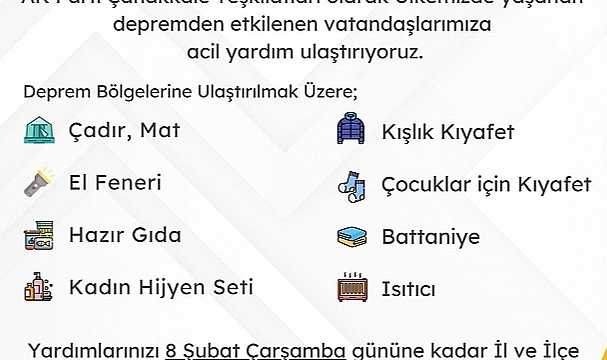 AK Parti İl Başkanlığından yapılan açıklamaya göre, "Ülkemizde yaşanan deprem felaketinde etkilenen vatandaşlarımıza ulaştırılmak üzere Çadır, Mat, El Feneri, Gıda Maddeleri, Kadın Hijyen Malzemeleri, Battaniye, Çocuk Kıyafetleri, Su, Isıtıcı gibi birçok malzemeye ihtiyaç vardır. Her koşulda vatandaşlarımızın yanında olan Çanakkale Halkımızın bu konuya hassasiyetle yaklaşarak destek olacağına eminiz. Gün birlikte olma günüdür. Yardımlarınızı 8 Şubat Çarşamba gününe kadar AK PArti İl ve İlçe Başkanlıklarımıza ulaştırmanız gerekmektedir" denildi.