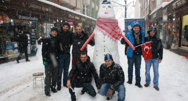 Bursa’da kar yağışı hayatı olumsuz etkilerken, alışveriş durma noktasına geldi. Dükkanlarının önündeki karları temizleyen esnaf, kardan kadın yaptı. Özenle yaptıkları kardan kadın ve adamları süslemeyi ihmal etmeyen esnaf, ayrıca Türk bayraklarıyla bunları renklendirdi.