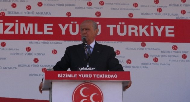 7 Haziran seçimlerinde Tekirdağlılardan oy isteyen Bahçeli, ”Onurlu bir geleceğe ulaşmak istiyorsanız, bizimle yürüyün. Huzurlu bir geleceğe varmak istiyorsanız, bizimle yürüyün. Sosyal ve ekonomik meseleleriniz bitsin diyorsanız, şüphesiz bizimle yürüyün. Bizim yürüyüşümüz ilkelidir. Bizim yürüyüşümüz adil, adaletli ve ahlaklıdır. Bizim yürüyüşümüz Türkiye ve Türk milletinin beka ve tarihsel menfaatlerini gözetmektedir. Vatan topraklarını bırakıp kaçanlar bizim yürüyüşümüzü anlayamazlar. Haçlılar’la BOP amaçlarıyla uygun adımda yürüyenler, bizim etrafımızda bulunamazlar. Yürüyüşümüz hainlerin korkulu rüyasıdır. Yürüyüşümüz terörle müzakere edenlerin kabusudur. Yürüyüşümüz yolsuzluğa bulaşanları, rüşvete saplananları, kul hakkı yiyenleri tepeleyecek, silip süpürecektir. Zira kurtaracak gün kalmadı. Tekirdağlı kardeşim, bu yangını söndürmek için artık harekete geçme vakti gelmiştir. Seçim günü oyunuzu Milliyetçi Hareket’e veriniz. Milliyetçi Hareket’in üç hilaline ‘evet’ mührünü basınız ” diye konuştu.