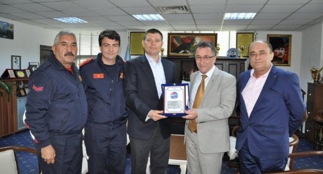 TSSF Başkanı İnkılap Obruk tarafından gönderilen plaketi TSSF Balıkesir İl Temsilcisi Nazım Ergelen adına, Edremit İtfaiye Amirliği’nden Fatih Asar, Mustafa Bilgiç, Hüseyin Afacan ve TSSF Milli Sporcusu Sedat Osmanoğlu, Başkan Saka’ya sundu.