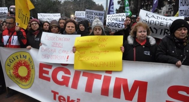 Grup adına basın açıklamasında bulunan Eğitim Sen Tekirdağ sekreteri Filiz Dikdönek, Özgecan’nın ailesine baş sağlığı dileyerek, “Eğitim Sen’li kadınlar olarak 20 yaşında genç bir kadın olan Özgecan’ı vahşice katleden canilerden ve katliamı önlemeyen erkek egemen sisteminden sorulacak hesabımız var. Özgecan Aslan’ın hayatının baharında giydiği kefeni kızlarımızın-kadınlarımızın giymemesi için cinsiyet eşitliği istiyoruz. Bunun gelecek kuşaklara eğitim olarak verilmesini istiyoruz” dedi.