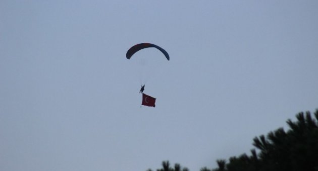 Çanakkale’nin Yenice ilçesinde, bir yamaç paraşütçüsü, terörü kınamak için havada Türk bayrağı açtı.