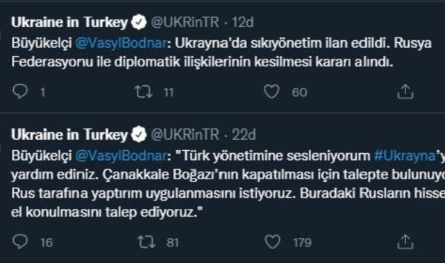 UKRAYNA'nın Ankara Büyükelçisi Vasyl Bodnar, "Türk yönetimine sesleniyorum; Ukrayna'ya yardım ediniz. Çanakkale Boğazı'nın kapatılması için talepte bulunuyoruz" dedi.